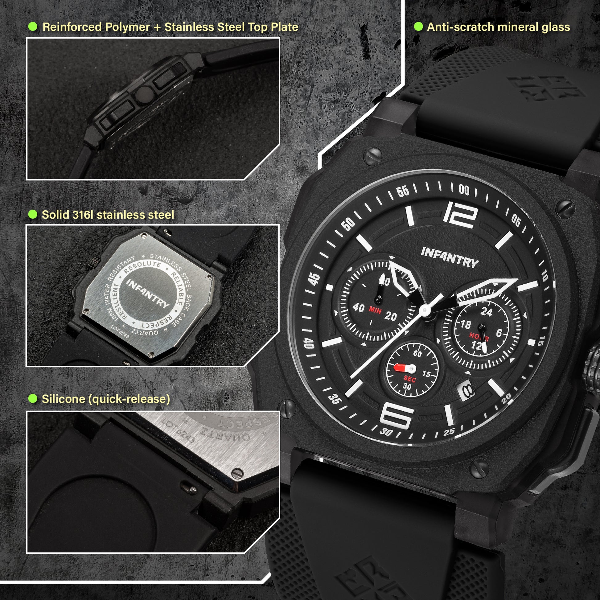 - Reinforced polymer + stainless steel top plate watch case