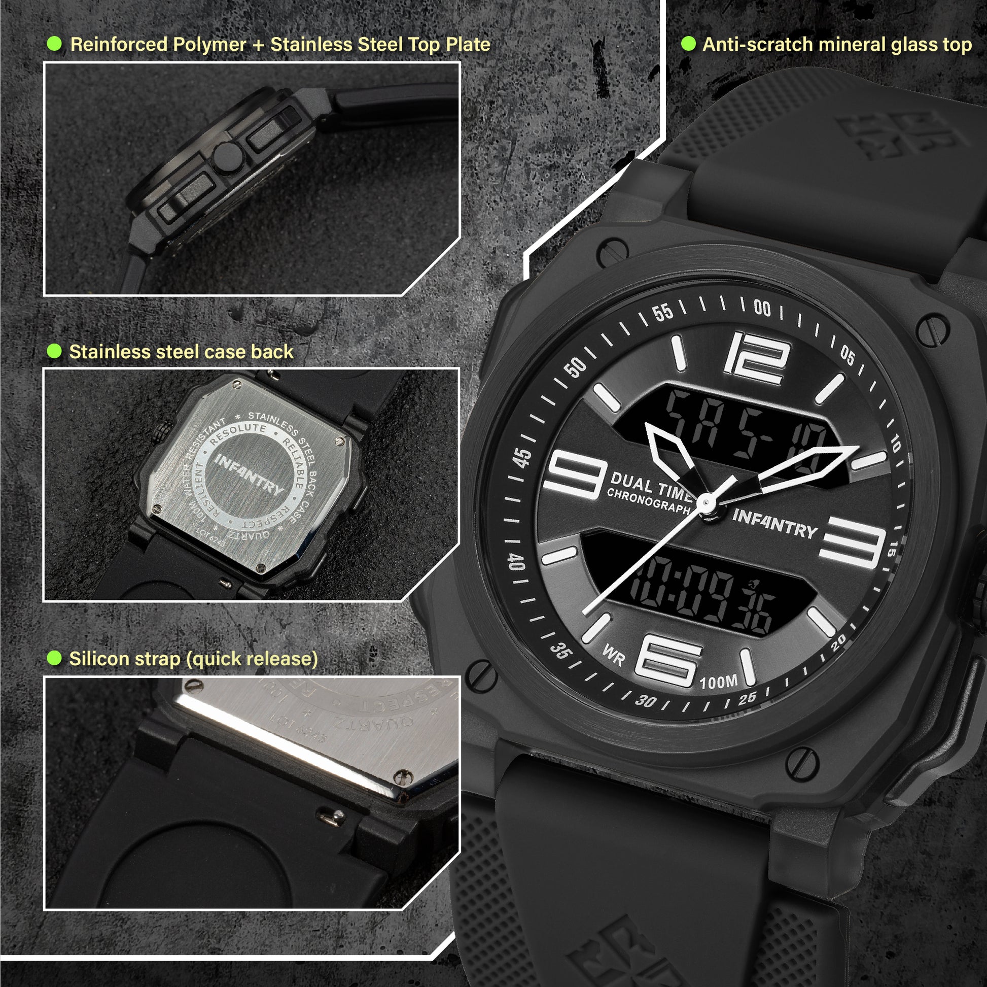 - Reinforced polymer + stainless steel top plate watch case